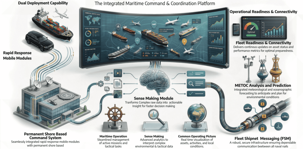 The platform features a Maritime Operations Module for efficient planning and execution, alongside a Sense Making Module that transforms complex data into clear, actionable insights. A robust Shore Based Reporting System enables seamless information exchange and structured reporting across locations.